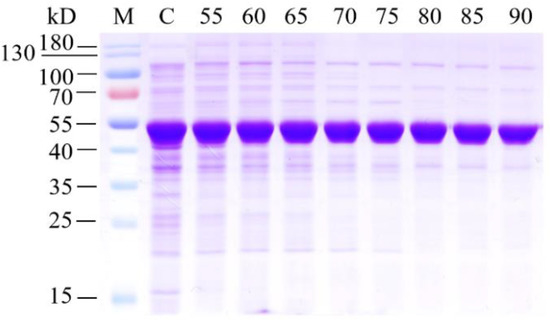 Fumarase from Thermus thermophilus was successfully expressed as a soluble protein in Escherichia coli. A thick band of approximately 50 kDa in size was observed on the sodium dodecyl sulphate–polyacrylamide gel electrophoresis gel (SDS–PAGE) (Figure 1), similar to that described in previous studies [15]. According to previous reports, the use of purified fumarase is advantageous compared to the use of whole cells, as the former has 105-fold higher activity than the latter [18]. However, it is difficult to obtain a large amount of purified enzyme in an industrial setting. In this study, fumarase was purified from transformed E. coli using heat treatment due to its excellent enzyme stability. As shown in Figure 1, as the preheating temperature increased from 55 to 90 °C, most of the expressed fumarase remained in the soluble fraction. Activity analysis revealed that the highest specific activity (87.0 U mg−1) was obtained at 85 °C. A higher preheating temperature irreversibly inactivated fumarase, leading to a decrease in specific activity. Based on these results, the partially purified fumarase that had been heat-treated at 85 °C for 20 min was used for the following immobilization studies.