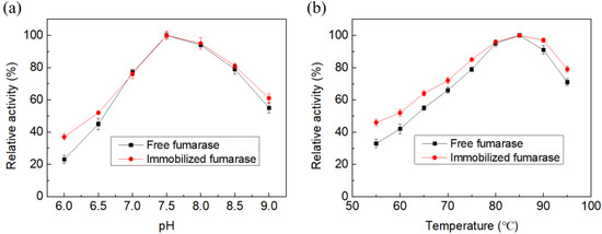 Temperature and pH play vital roles in the proper functioning of immobilized enzymes. In the current study, both free and immobilized fumarases showed maximum initial activity at an optimum pH of 7.5 and temperature of 85 °C (Figure 2). Furthermore, immobilized fumarase showed higher activity than free fumarase over wider pH and temperature ranges (Figure 3). Both free and immobilized fumarase beads were thermostable in the range of 40–70 °C (Figure 3). After 2 h of incubation, free fumarase retained 82.6% and 65.0% residual activity at 80 °C and 90 °C, respectively. Immobilized fumarase showed higher stability at both temperature conditions, with 96.0% and 87.1% residual activity at 80 °C and 90 °C, respectively.