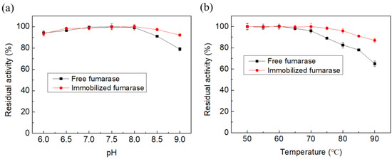 The residual activity of immobilized and free fumarase incubated at different pH (a) and temperature (b) conditions for 2 h.