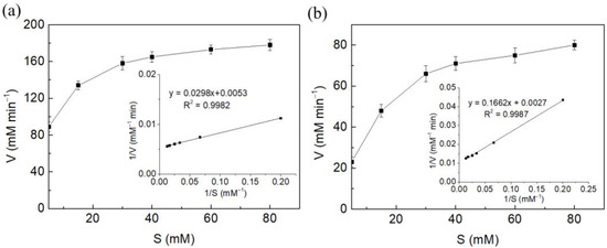 Lineweaver–Burk and Michaelis–Menten plots of free (a) and immobilized (b) fumarase.