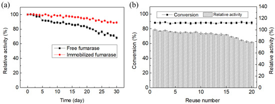 Storage (a) and recyclability (b) of immobilized and free fumarase.