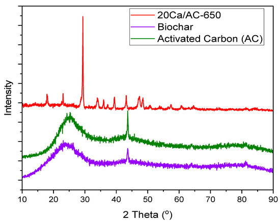 Biochar and activated carbon samples showed a wide peak between 2θ = 10° and 30°), and a sharp stretching peak in the activated carbon sample at 2θ = 42°–45° ascribed to the presence of hexagonal graphitic carbon, indicating the synthesis of mesoporous structure. Afterwards, when activated carbon is loaded with CaO, clear diffraction peaks could be observed at 2θ = 32.2°, 37.35°, 53.80°, 64°, and 67.31°, demonstrating the existence of CaO crystallites and hence justifying Ca loading on active sites. The sharp peak at 2θ = 29.5° in the XRD sample of calcium-loaded activated carbon is due to the presence of CaCO3, which is formed as a result of the reaction between loaded CaO and CO2 during the synthesis process of catalyst [60,61].