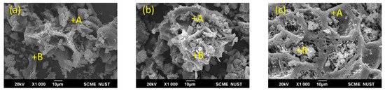 Figure 2 indicates that the surface structure of the catalysts examined by the SEM analyzer differs drastically. Figure 2a shows the biochar’s SEM image which depicts low mesoporosity and rough structure, giving it a textured appearance. The emission of noxious compounds during heat treatment resulted in a shape that facilitates calcium ions’ absorption and binding. Biochar treatment resulted in an uneven, porous surface, as seen in Figure 2b. Even this outcome was in line with the BET results of the treated biochar sample, which shows dramatically enhanced pore volume. Compared with the previous findings, it was clear that CaO evenly covers the activated carbon support, resulting in a highly porous catalyst with even pore distribution on the catalyst’s surface. As a result, we can see a dramatic increase in the basic strength and surface area of the synthesized calcium-coated activated carbon catalyst.