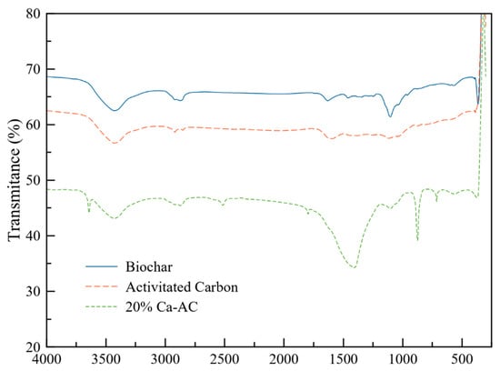 With the aid of FTIR analysis, the structural knowledge of the prepared samples could be studied. Figure 3 depicts the FTIR data of biochar, and its activated sample and the final optimized catalyst utilized throughout our experimentation 20Ca/AC-650 catalyst. At 3450 cm−1 wideband could be observed in all characterized samples; this band was portraying the presence of the -OH group at the catalyst surface. When activated carbon is loaded with CaO, a sharp peak can be observed near 1470 cm−1, 873 cm−1, and 714 cm−1 correlated with asymmetric stretch showing the presence of CaCO3, which is mainly due to incomplete carbonization CaO. Literature studies revealed that Ca(OH)2 structural hydroxyl groups are responsible for the abrupt extending band at 3644 cm−1 [62]. Aromatic hydrocarbon molecules were linked by C=C extending in the FTIR spectrum of biochar observed by the 1620 cm−1 band, and the C–O stretching of hydroxyl groups was linked by plan bands at 1120, 1088, and 1056 cm−1 [37]. These results were also justified by XRD patterns shown in Figure 3.