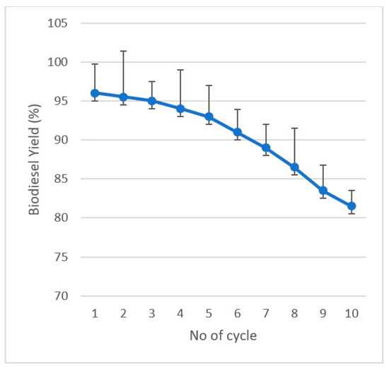 By retrieving and reutilizing the catalyst in the transesterification process, we were able to examine the potential of sustainable heterogeneous and recyclable catalyst synthesis from the Prunus persica shell. To remove the oil from the catalyst surface, methanol and tetrahydrofuran were used to thoroughly wash it, followed by drying in a vacuum oven at 105 °C after it had been extracted from the reaction mixture. The catalytic performance of 20Ca/AC-650 was tested using the recycled catalyst in consecutive cycles under optimized conditions: reaction temperature 65 °C, reaction time 140 min, catalyst loading 5 wt%, and oil to methanol molar ratio 1:8. As shown in Figure 5, the 20Ca/AC-650 catalyst yield decreased from 96.0% to 81.50% over the first 10 cycles of the transesterification reaction. Reusability results revealed that the CaO-supported carbon-based catalyst is highly stable and sustainable even after 10 repeated cycles.