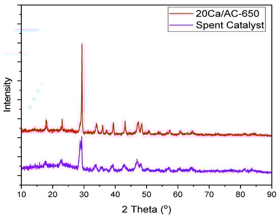 The XRD approach shown in Figure 6 was applied to investigate the depreciation of the catalyst in more detail for both fresh and spent 20Ca/AC-650 catalysts recovered after the 10th cycle. More substantial peaks of Ca in the XRD pattern of fresh 20Ca/AC-650 catalyst could be observed compared to the spent catalyst recovered after the 10th cycle, therefore showing weak calcium peaks; this result indicated the leaching of Ca+2 from the active site in every cycle, which ultimately led to a decrease in overall calcium content on the catalyst surface.