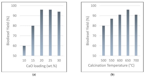 Figure 7 shows the impact of preparation conditions on the biodiesel yield of several catalysts. Figure 7a shows that when CaO loading increased from 10 to 20% by weight, the yield increased from 60% to 96%. BET studies showed that when CaO was added, the catalyst’s catalytic activity dramatically increased because of its higher total basicity; however, biodiesel production had no discernible improvement when the CaO loading increased to 30%. In contrast to the surface area, the basicity was shown to have a larger impact on catalytic activity. Based on the foregoing data, it can be concluded that a CaO loading of less than 20% was insufficient for the transesterification process to proceed because of the lower number of basic sites available. Even with higher CaO loadings of more than 20 wt.%, the catalyst’s catalytic performance was not significantly improved. It is possible that inadequate diffusion of the active species on the catalyst surface was caused by the crystallization or agglomeration of Ca compounds. Therefore, the catalyst with a CaO loading of 20 wt.% was selected for a further transesterification process.