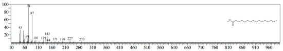 Comp Name: Hexadecanoic acid, methyl ester, Run Time: 15.402, Mol Weight: 270.