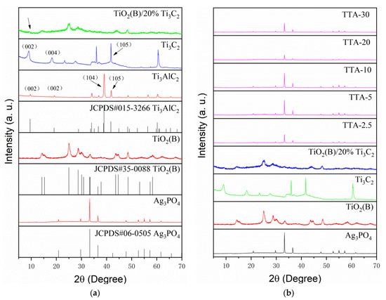 (a) XRD diffraction patterns of Ag3PO4, TiO2(B), Ti3AlC2, Ti3C2 and TiO2(B)/20%Ti3C2; (b) XRD diffraction patterns of TTA-2.5, TTA-5, TTA-10, TTA-20 and TTA-30.