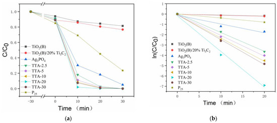 Figure 3a shows the degradation curves of the samples. The photocatalytic performance of the TiO2(B)/Ti3C2 MXene/Ag3PO4 composite was significantly higher than those of the TiO2(B), Ag3PO4 and TiO2(B)/20%Ti3C2 MXene and is significantly higher than that of photocatalyst P25 sold in the market. The photocatalytic performance of the TiO2(B)/Ti3C2 MXene/Ag3PO4 composite first increased with the increase in the content of the Ti3C2 MXene and reached the highest value when the content was increased to 20%, beyond which further increases and lowered the photocatalytic performance of the composite instead. Figure 3b shows a linear fit of the degradation kinetics of the samples. According to the Langmuir–Hinshelwood model, the degradation reaction can be considered to be a first-order reaction at low RhB concentrations, and thus, the fitting of the degradation kinetics can be simplified to a linear case. The degradation reaction in this experiment satisfied the apparent first-order reaction rate equation ln(C/C0) = −k·t, where k is the apparent first-order reaction rate constant. Thus, ln(C/C0) is a function of the irradiation time t. The k values of the TiO2(B), TiO2(B)/20%Ti3C2 MXene, Ag3PO4 and P25 were low, with values of 0.008, 0.011, 0.085 and 0.04 min−1, respectively, while the k value corresponding to TTA(TiO2(B)/Ti3C2 MXene/Ag3PO4) was significantly higher, which gradually increased from kTTA-2.5 = 0.182 min−1 to the maximum kTTA-20 = 0.345 min−1 and then decreased to kTTA-30 = 0.241 min−1.