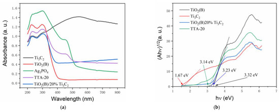 Figure 4 shows the UV-Vis absorption spectra of the samples. Compared with TiO2(B), the visible light absorption capacity was clearly improved after forming a composite of TiO2(B) and Ti3C2 MXene, and the light absorption performance of sample TTA-20 obtained by further incorporating Ag3PO4 was even higher. The band gaps of the Ti3C2, TiO2(B), TiO2(B)/20%Ti3C2 MXene, and TTA-20 were calculated to be 1.67, 3.14, 3.23, and 3.32 eV, respectively, based on the Tauc plot. These results confirmed the band gap reduction by the formation of the composite, which is an important reason for the improved light absorption performances of the composite materials.