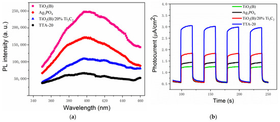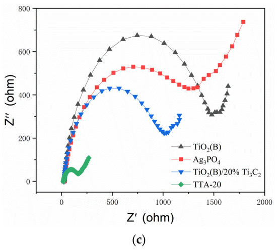 As shown in Figure 5, the fluorescence emission spectra as well as the transient photocurrent response and electrochemical impedance Nyquist plots of the samples were obtained to analyze the influence of the formation of composites on the recombination and migration of photogenerated electron–hole pairs in the samples. Figure 5a shows that the fluorescence of the TiO2(B)/20%Ti3C2 MXene was significantly weaker than that of the TiO2(B), and the fluorescence of TTA-20 (TiO2(B)/20%Ti3C2 MXene/Ag3PO4) was the weakest. This was because the highly conductive Ti3C2 MXene was composited with TiO2(B) to form Schottky junctions on the contact surface, which caused the fast migration of photogenerated electrons to the Ti3C2 MXene, achieving rapid separation of photogenerated electron–hole pairs and suppressing the recombination. By forming the Ti3C2 MXene and TiO2(B) composite, Ag3PO4 quantum dots were introduced on the surfaces of the Ti3C2 MXene and TiO2(B) by in situ self-growth, the Ag3PO4 and Ti3C2 MXene formed Schottky junctions, and the Ag3PO4 and TiO2(B) formed heterojunctions. These junctions created a synergistic effect with the Schottky junctions formed by the Ti3C2 MXene and TiO2(B), further promoting the rapid migration and separation of photogenerated electrons and greatly suppressing the recombination of photogenerated electron–hole pairs. Figure 5b shows the transient photocurrent responses of the samples. The photocurrents of the samples were enhanced by compositing. The photocurrent of TTA-20 was the strongest, followed by those of the TiO2(B)/20%Ti3C2 MXene, Ag3PO4, and TiO2(B), in that order. The photocurrent enhancement pattern was consistent with the fluorescence weakening pattern, and the photocurrent enhancement also indicated that the recombination of photogenerated electron–hole pairs was effectively suppressed. Thus, Figure 5b further confirms the results and analysis of Figure 5a. Figure 5c shows the Nyquist plot of the electrochemical impedances of the samples. In general, the smaller the curvature radius of the curve is, the greater the electron mobility of the sample is. The mobility was significantly enhanced by forming the composite. The electron mobility of TTA-20 was the largest, followed by that of the TiO2(B)/20%Ti3C2 MXene, and both were larger than those of the TiO2(B) and Ag3PO4.