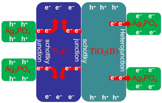 In this study, the TiO2(B)/Ti3C2 MXene Schottky junction composite was first prepared by electrostatic self-assembly, and then Ag3PO4 quantum dots were generated on the surface of the TiO2(B)/Ti3C2 MXene by in situ self-growth, thereby forming Ag3PO4/TiO2(B) heterojunctions and Ag3PO4/Ti3C2 MXene Schottky junctions. Through the successful construction and synergy of these functional junctions (As shown in Figure 7), the light absorption capacity of the composite photocatalyst was greatly enhanced, and the recombination of photogenerated electron–hole pairs was effectively suppressed, thus substantially improving the photocatalytic degradation performance of the composite photocatalyst. It was further found that the photocatalytic performance of the TiO2(B)/Ti3C2 MXene/Ag3PO4 composite increased with the increase in the Ti3C2 MXene content, and it reached the maximum when the Ti3C2 MXene content increased to 20%, beyond which the photocatalytic performance of the composite decreased as the Ti3C2 MXene content continued to increase.