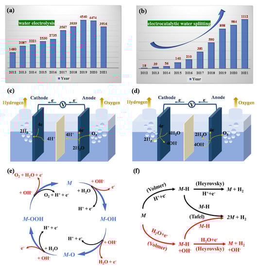 - Hu, C.; Zhang, L.; Gong, J. Recent progress made in the mechanism comprehension and design of electrocatalysts for alkaline water splitting. Energy Environ. Sci. 2019, 12, 2620–2645. [Google Scholar] [CrossRef]