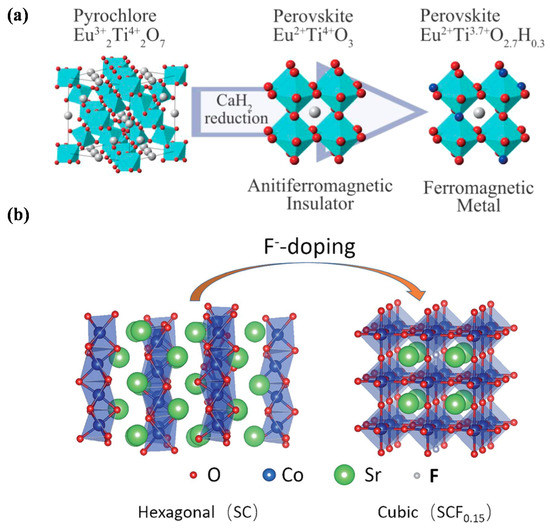 - Hayward, M.A.; Cussen, E.J.; Claridge, J.B.; Bieringer, M.; Rosseinsky, M.J.; Kiely, C.J.; Blundell, S.J.; Marshall, I.M.; Pratt, F.L. The hydride anion in an extended transition metal oxide array: LaSrCoO3H0.7. Science 2002, 295, 1882–1884. [Google Scholar] [CrossRef] [Green Version]