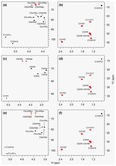 Selected regions of the of the multiplicity-edited 1H,13C-HSQC spectra (500 MHz, 298 K, MeOD-d4) of (a,b) 5-O-lauroyl-d-xylofuranose (4), (c,d) 6-O-lauroyl-d-glucopyranose (5) and (e,f) 5-O-lauroyl-d-arabinofuranose (6) showing one-bond proton-carbon correlations from the sugar (left panels (a), (c) and (e), respectively) and lauroyl moieties (right panels (b), (d) and (f), respectively).