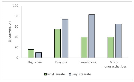 Bioconversion percentage of d-glucose, l-arabinose, or d-xylose at (a) and (b) conditions are shown in Figure 4. The synthesis of d-glucose laurate and stearate esters led to low yields, which is similar to that reported by previous studies using Rhizomucor miehei lipase (Figure 4) [37,55,56,57].