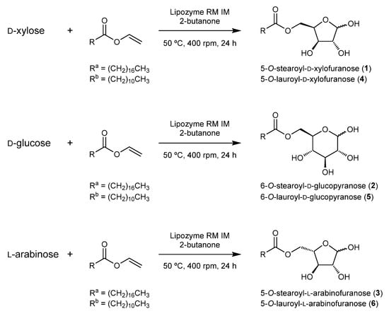 Lipase-catalyzed synthesis of sugar fatty acid esters (1–6), using d-glucose, l-arabinose, d-xylose and fatty acid vinyl esters as substrates.