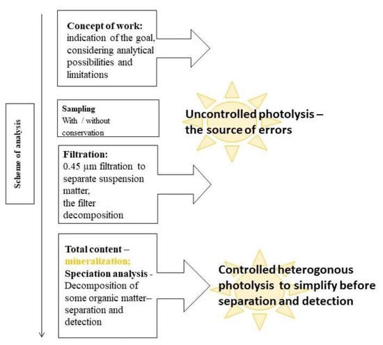 The results obtained with a precise and accurate measurement technique do not mean much when the analytical signals are interfered with by the presence of organic compounds. However, in the case of ultra-trace analysis or determination of individual forms of an element (speciation analysis), traditional mineralization (oxidation of organic compounds) is not an option [62,63]. The scheme of the analytical procedure of water samples is exhibited in Figure 1.