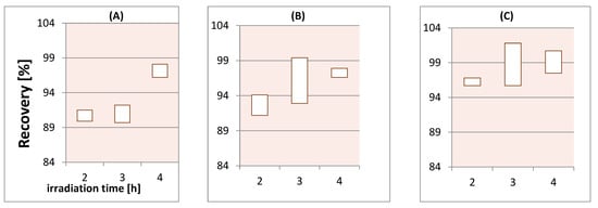 A very interesting technique is the employment of semiconductor layers organized and selected to meet the needs of analysts. The determination of traces of metals using stripping voltammetry was supported by the degradation of surfactants utilizing hierarchical and bicomponent admixtures of tungsten(VI) oxide and iron(III) oxide (hematite) [73]. The decomposition, or, rather, simplification, of SDS and Triton™X-114 reached 100% after 2 or 3 h, respectively, of solar-light-irradiation-assisted digestion in the case of mixed WO3 and Fe2O3, as well as in a hierarchical system with an Fe2O3 layer between WO3 layers. It should be emphasized that, depending on the layer system, it is possible to work with an acidified water sample (pH < 2—permanently to determine the total content) or an unmodified sample (4 < pH < 6—for speciation analysis). In Figure 2, the range of the % Pb recovery is shown, which was fully as expected following the effective heterogeneous photodegradation of a very resistant surfactant (Triton). Increasing exposure time caused not only a better recovery but, also, the precision of voltametric determination was expressed in % of the value spread, meaning that the decomposition was much better.