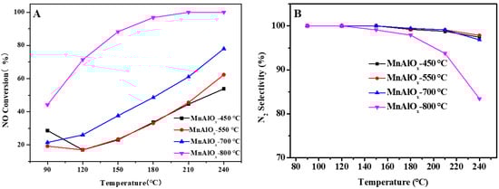 Figure 1 shows that the NH3-SCR performances over MnAlOx-T catalysts calcined at different temperatures. As shown in Figure 1, the NOx conversion of MnAlOx-T catalysts increased with raising the reaction temperature in the temperature range of 90~240 °C. It could be observed that the MnAlOx-450 °C and MnAlOx-550 °C catalysts exhibited a similar catalytic activity throughout the whole temperature range. In contrast, the MnAlOx-800 °C shows exceptional activity, and the NOx conversion was more than 90% in the range of 150~240 °C.