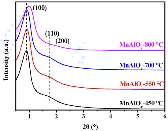 Proof of the appearance of ordered mesostructure for the MnAlOx samples is afforded by the small angle XRD patterns (Figure 3) and TEM images (Figure 4). It is well-known that the small angle X-ray diffraction patterns provide information about the possible organization of mesopores [,]. As illustrated in Figure 3, very strong diffraction peaks of (110) plane around 0.8° and a weak and overlapped diffraction peaks of (110) and (200) plane around 1.7° for mesoporous MnAlOx were observed, which suggested the formation of ordered mesoporous structure. Therefore, the small-angle XRD patterns indicate the presence of uniform mesoporous.