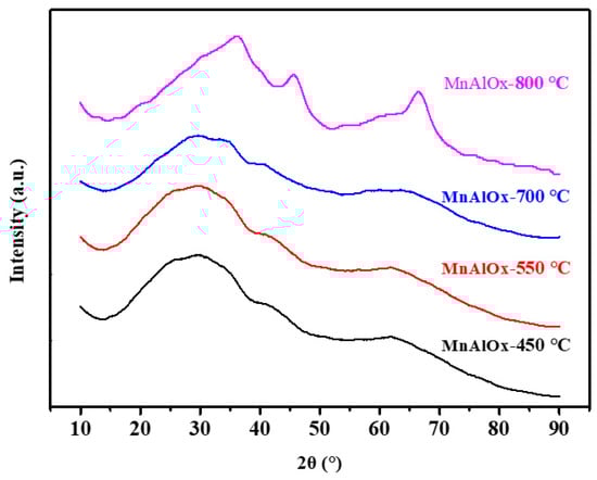 Wide-angle XRD patterns of mesoporous MnAlOx catalysts results were depicted in Figure 5. The diffraction peaks of all MnAlOx catalysts are a weak and broad peak, indicating a poor crystallinity of MnAlOx catalysts. MnAlOx catalysts calcined at 800 °C begin to display crystallinity, as supported by the powder XRD patterns with distinctive peaks. Calcination at 450 °C gives rise to the mesostructure with amorphous wall, and then the amorphous wall is converted to γ-Al2O3 phase (JCPDS No. 10-0425) after further treatment at a temperature of 800 °C. Furthermore, the diffraction peaks assigned to MnOx cannot be detected, indicating that the active components (MnOx) were evenly distributed on the Al2O3 surface. Furthermore, we characterized the element dispersion of the MnAlOx catalysts via SEM-EDS measurements.