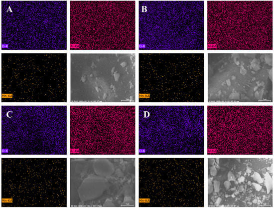 SEM-EDS images of (A) MnAlOx-450 °C, (B) MnAlOx-550 °C, (C) MnAlOx-700 °C, (D) MnAlOx-800 °C.