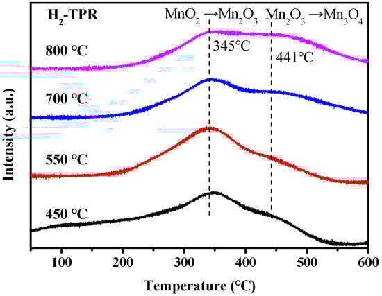 To discuss the redox behavior of catalysts in this work, the H2-TPR profiles of different catalysts are shown in Figure 9. Previous studies have demonstrated that the H2-TPR profile of pristine MnOx exhibits three reduction peaks at approximately 367, 455, and 517 °C, ascribed to the stepwise reduction of MnO2 to Mn2O3, Mn2O3 to Mn3O4, Mn3O4 to MnO, respectively []. All of the H2-TPR profiles of the MnAlOx catalysts present two distinct H2 consumption peaks around 345 and 441 °C, which were attributed to the reduction of MnO2 to Mn2O3, then Mn2O3 to Mn3O4 with the increased temperature. Compared to the area of the two peaks, it is deduced that the peak ascribed to the reduction of MnO2 to Mn2O3 has a larger area, indicating that MnO2 is the predominant phase in the catalytic formulations in comparison with Mn2O3.