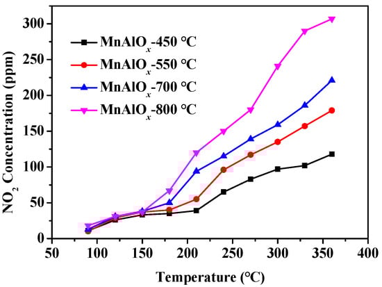 It is reported that the enhancement of NO oxidation to NO2 could significantly promote the catalytic activity of SCR catalysts at low temperature due to the occurrence of the fast SCR reaction: 2NH3 + NO + NO2 → 2N2 + 3H2O [,]. Although it is mentioned that the fast SCR reaction can promote the denitration activity, this conclusion is only based on speculation. In order to more accurately determine whether a fast SCR occurred in the reaction, we further studied the process of NO oxidation to NO2 and the results are clearly illustrated in Figure 11. With the increasing calcination temperature, the NO oxidation to NO2 shows an obvious increase. This activity might be related to the fact that the catalyst prepared at higher calcination temperatures could provide a much more Mn4+, which is beneficial to the NO oxidation reaction. Furthermore, the stronger basicity of the higher calcination temperature catalysts, which is beneficial to the adsorption of NOx, is also the cause of the enhanced NO oxidation ability [].