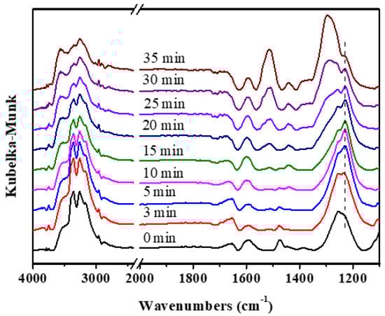 The reaction between NH3 and pre-adsorbed NO + O2 at 210 °C is also performed on MnAlOx-800 °C catalysts by in situ DRIFTs. As shown in Figure 15, the intensity of bands at 1535 and 1292 cm−1 assigned to bidentate nitrate progressively decreased to some extent with an increase in the exposure time in 500 ppm of NH3, indicating that bidentate nitrates were the reactive species for NH3-SCR reaction. Meanwhile, the bands at 1627 cm−1 attributed to adsorbed NO2 progressively disappeared with increasing the exposure time of NH3, suggesting that the adsorbed NO2 were the reactive species. In addition, new bands at 3328 cm−1 corresponding to the stretching vibration of NH3 adsorbed on Lewis acid sites were detected and strengthened with increasing the exposure time of NH3. The Langmuir–Hinshelwood (L–H) mechanism is universally considered as the adsorbed A reacted with adsorbed B. Therefore, the adsorbed NOx species were capable of reacting with coordinated NH3 following L–H mechanism. Furthermore, the MnAlOx-800 °C catalysts could enhance the transformation of nitrites to nitrates, which are the reactive intermediates and could react with NH3, thus the MnAlOx-800 °C catalysts have a higher SCR activity than that of the other MnAlOx catalysts.