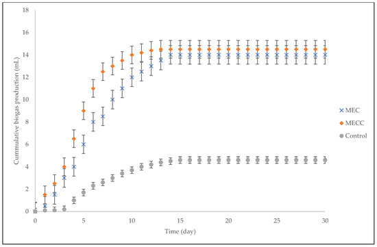 Figure 2 shows the biogas production of the digesters daily. After passing the lag phase, the digesters reached the exponential growth stage. During the exponential growth phase, the digesters firstly showed an exponential growth rate at an accelerating rate and then at a decelerating rate. Each digester then reached the inflection point, a point where curvature changes, i.e., from accelerating to decelerating. The MECC reached the inflection point earlier, followed by MEC and then lastly the control. The MECC had the greatest daily production of 2.5 mL (91.9 mL/g VSfed) on day 5. After passing the inflection point, the digesters showed a deceleration in biogas production. The digesters then reached the steady-state phase, where there was no biogas production. It is evident from the graph that all digesters ceased production after day 15.