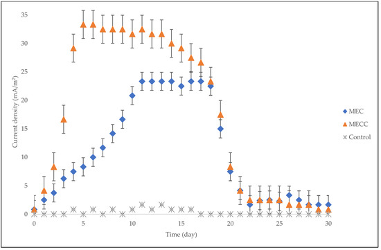 On the other hand, the maximum current densities of 33.3, 23.3, and 0.1 mA/m2 corresponded to coulombic efficiencies of 54.5% (MECC), 39.5% (MEC), and 0% (control), respectively. Therefore, an increase in current density enhanced coulombic efficiency.