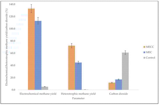 Even though the biochemical systems, both MECC and MEC, showed higher methane productions than the control, it is important to know the path that the methane took, i.e., the heterotrophic path (breaking down of complex matter) or the autotrophic path (generation of complex matter). The electrochemical methane yield and heterotrophic methane yield were fundamental parameters determining the path that the produced methane took (Figure 4). In general, an electrochemical methane yield that is above 100% denotes a higher COD to methane conversion rate. The electrochemical methane yield for MECC was 133.0%, that for MEC was 112.9%, and that for the control was 5.2%. Both biochemical systems had electrochemical methane yields greater than 100%, which implied that most of the methane produced took the heterotrophic path as opposed to the autotrophic path [36]. This was also confirmed by the fact that the contents of carbon dioxide in the bioelectrochemical systems (MECC = 11.8% and MEC = 17.0), were smaller than that in the control (60.9%) as well as higher heterotrophic methane yield (MECC = 72.3% and MEC = 44.6%), which further suggested the electrochemical reduction of carbon dioxide. The best-performing digester was the MECC, with the greatest electrochemical methane yield of 133.0%, the greatest heterotrophic methane yield of 72.3%, and the lowest carbon dioxide content of 11.8%, which denoted high conversion of carbon dioxide to methane, and hence, the heterotrophic pathway. On the other hand, the control revealed the lowest electrochemical methane yield, which suggested that the majority of the methane it produced took the autotrophic pathway, i.e., generation of complex matter.