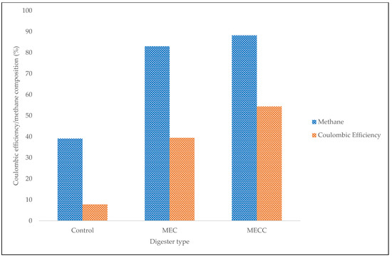 The coulombic efficiency is another important electrochemical characterization that governs the efficiency of a bioelectrochemical system. Coulombic efficiency is the percentage ratio between heterotrophic methane yield and electrochemical methane yield [5]. Basically, the coulombic efficiency denotes the amount of biochemical matter directly transformed into the current. In biochemical systems, higher coulombic efficiency values are desirable, as they signify higher biochemical matter to current conversion rates. Figure 5 presents coulombic efficiency and methane composition concerning digester type. The increasing order of the coulombic efficiencies depicts the following: MECC: 54.5% > MEC: 39.5% > control: 0% for methane compositions of 88.2%, 83.0%, and 39.1%, respectively. This suggests that an increase in coulombic efficiency was accompanied by an increase in methane composition. The greatest coulombic efficiency of 54.5% was achieved by the MECC, and this was due to the high methane content in the digester (88.2%) [37]. In addition to methane content, the coulombic efficiency is also influenced by ohmic losses, i.e., resistance that electrons and ions face as they move across a bioelectrochemical system. The higher the ohmic losses, the higher the resistance that electrons and ions experience, and hence, the lower the coulombic efficiency. Thus, the high coulombic efficiency of the MECC suggested that there were smaller ohmic losses in that system than in the other digesters. This means that the majority of electrons in the MECC took the heterotrophic pathway as opposed to the autotrophic pathway.