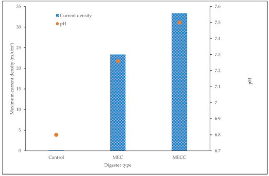 In anaerobic digestion, the stability of the process can be obtained from the stable parameters of deterioration solution; for instance, pH. The pH of a solution in anaerobic digestion is vital since it influences bacterial growth and activity. Figure 8 depicts the effect of maximum current density on the pH of the digesters. The optimum pH for improving the electroactive acetogenins lies between 6.8 and 7.0, whereas for enhancing electroactive methanogens’ performance, a pH in the range of 7.0 and 7.5 is required [36]. The digesters with a pH between 7.0 and 7.5 were MEC and MECC, which suggested that the synergistic bioelectrochemical system and Fe3O4-NPs helped to improve the electroactive methanogens’ performance. The maximum current densities for the control, MEC, and MECC were 0.1, 23.3, and 33.3 mA/m2, whereas the pH values were 6.80, 7.26, and 7.50, respectively. Therefore, this result showed a direct proportion between maximum current density and pH. Halim et al. [35] also observed that for a pH range between 6.0 and 8.0, pH increased with an increase in current density.