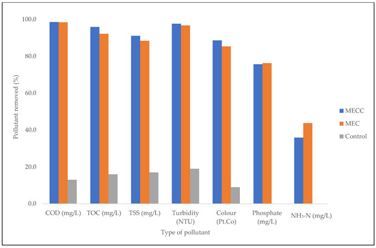 Figure 9 shows the effect of electrode configuration on contaminants removed, namely: COD, TOC, TSS, turbidity, color, phosphate, and ammonia-nitrogen (NH3-N). The synergistic effects of Fe3O4-NPs and the bioelectrochemical systems, both MEC and MECC, showed higher contaminant removal than the control, with over 35.8% removal. Amongst the contaminants tested, COD had the highest treatability performance, and this was achieved by both MEC and MECC. This suggests that the synergistic effects of Fe3O4-NPs and the bioelectrochemical systems mostly improved the COD-to-gas conversion. This confirms the results obtained above in the electrochemical characterization section, where the high EMYs (above 100%) on both MEC and MECC indicated higher conversion rates of COD to methane. However, the best-performing digester was the MECC, with better water pollutant removal with COD (98.6%), TOC (95.9%), TSS (91.1%), turbidity (97.7%), and color (88.6%). In contrast, phosphate (76.3%) and NH3-N (43.7%) removal was better in the MEC. The current densities for MECC and MEC were 33.3 mA/m2 and 23.3 mA/m2, whereas ammonia–nitrogen removal in each digester was 35.8% and 43.7%, respectively. This suggests that a decrease in current density increased ammonia–nitrogen removal. The same observation was found by Yao et al. [32], who observed that higher current densities resulted in low ammonia removal.