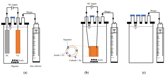Drawing of anaerobic digestion: (a) rectangular microbial electrolysis cell (MEC); (b) cylindrical microbial electrolysis cell (MECC); and (c) control.