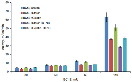 BChE incorporated in the starch and gelatin gels retained its activity (Figure 2). The preparation based on gelatin gel showed greater activity compared to the starch gel preparation, with the S-BCh-I hydrolysis rate being 30% higher (Figure 2). Another finding was that DTNB immobilization in the preparations did not result in any significant loss of activity of the preparations based on either starch or gelatin gel (Figure 2). Keeping BChE active indicates the absence of restrictions arising from the diffusion of DTNB from the polymer matrix of the carrier.