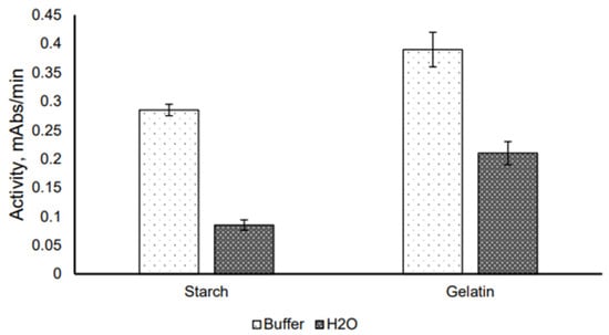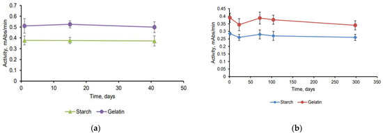 To analyze the stability of the preparations during storage, changes in their activities were monitored for two months. The activity of the enzyme in the starch or gelatin gel stored less than two months changed insignificantly (Figure 3a), suggesting effective stabilization of the enzyme by these carriers.