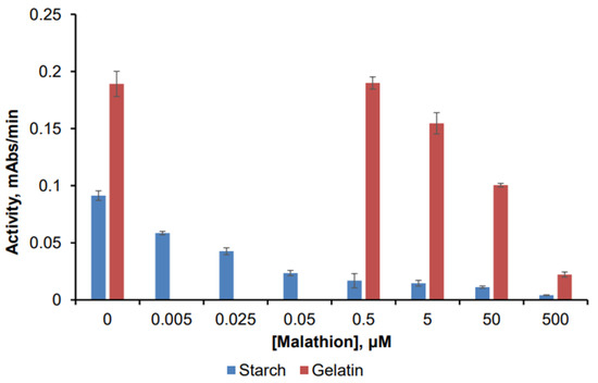 Preparations based on gelatin gel were found to be less sensitive to OPCs compared to the preparations based on starch gel. The activity of BChE immobilized in the gelatin carrier did not change in the presence of 0.5 µM of malathion—the amount 10 times higher than the MAC of this pesticide (Figure 5). This could be caused by the high degree of stabilization of the enzyme by the gelatin carrier. At the same time, preparations based on starch gel showed a 74% reduction in activity in the 0.05 µM malathion solution (malathion MAC).