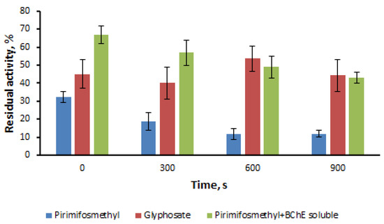 Figure 6. Residual activity of immobilized enzyme preparations based on starch gel vs. the time of incubation in the inhibitor solution ((pirimiphos-methyl) = 0.055 mM, (glyphosate) = 10 mM). Each preparation disk contained 0.11 U of BChE and 0.2 mM DTNB. Green columns are the residual activity of soluble BChE after incubation in 0.055 mM pirimiphos-methyl solution.