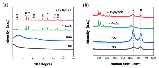 (a) XRD patterns and (b) Raman spectra of α-Fe2O3/RGO, α-Fe2O3, RGO, and GO.