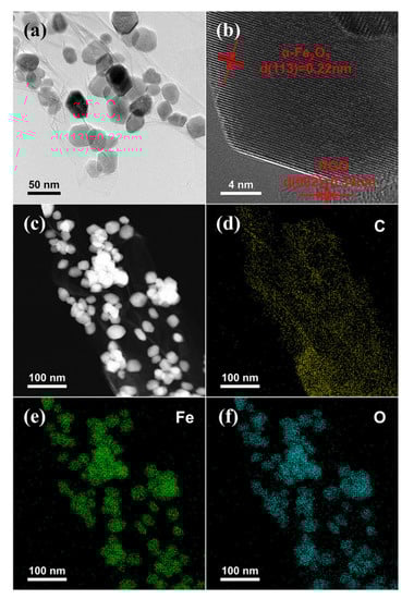 TEM studies of the α-Fe2O3/RGO composites were performed to define their microstructure further (Figure 3). Figure 3a shows that α-Fe2O3 solid nanoparticles ranging in size from 20 to 50 nm are evenly dispersed over RGO. This result also reveals efficient assembly of the α-Fe2O3 particles and graphene sheets during the hydrothermal treatment. The 0.22 nm lattice spacing in the (113) plane identifies the α-Fe2O3 particles (Figure 3b) [25], matching with the XRD data. The three images (Figure 3d–f) of the targeted region (Figure 3c) illustrate the TEM elemental mapping findings of the α-Fe2O3/RGO composites. Figure 3d demonstrates that carbon (C) atoms are numerous in the composites, but iron (Fe) and oxygen (O) atoms are scarce in Figure 3e,f. However, all three images demonstrate the distribution of C, Fe, and O elements in the α-Fe2O3/RGO composites are highly homogeneous.