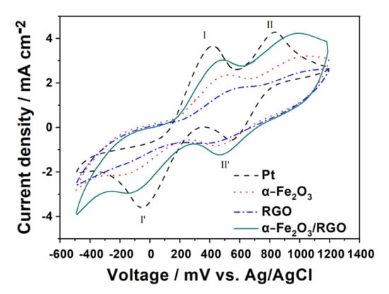 To evaluate the electrocatalytic activities of as-prepared α-Fe2O3/RGO, α-Fe2O3, RGO, and Pt, three-electrode cyclic voltammetry (CV) was performed (Figure 5). As previously reported, a representative curve with two couples of redox peaks was found for Pt. The I and I’ peaks correspond to the oxidation and reduction peaks of I3−/I2, whereas the II and II’ peaks correspond to those of I−/I3− [27]. During the electrochemical process in a DSSC, it is crucial that electrons from CE reduce I3− to I−. Therefore, the II and II’ peaks represent the electro-catalytic capabilities of the CEs. By analyzing the reduction peaks of all the CEs, we can see that the α-Fe2O3/RGO and Pt have sharper II’ peaks, demonstrating that their catalytic activities are considerably higher than others. It is well known that peak-to-peak separation and peak current density are two essential metrics for assessing the electrocatalytic activities of CE [28]. The magnitude of peak current density is correlated to the capacity of the CE to decrease the I3− species. Compared with pure RGO and α-Fe2O3 CEs, the α-Fe2O3/RGO CE exhibits a greater peak current density (Figure 5), indicating that it has stronger electrocatalytic activity and a faster response rate.