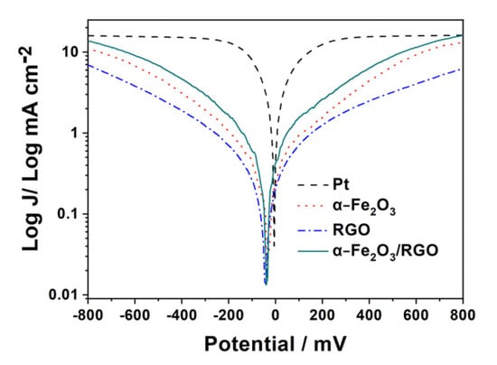 Tafel curves of the symmetrical cells fabricated with two identical α-Fe2O3/RGO, α-Fe2O3, RGO, and Pt electrodes.