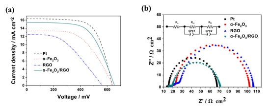 (a) Photocurrent density–voltage characteristics and (b) Nyquist plots of DSSCs with α-Fe2O3/RGO, α-Fe2O3, RGO, and Pt CEs measured at AM 1.5 G illumination (100 mW cm−2). The inset in (b) is the equivalent circuit of the DSSCs.