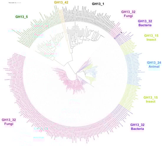 - Stam, M.R.; Danchin, E.G.; Rancurel, C.; Coutinho, P.M.; Henrissat, B. Dividing the large glycoside hydrolase family 13 into subfamilies: Towards improved functional annotations of alpha-amylase-related proteins. Protein Eng. Des. Sel. 2006, 19, 555–562. [Google Scholar] [CrossRef] [Green Version]