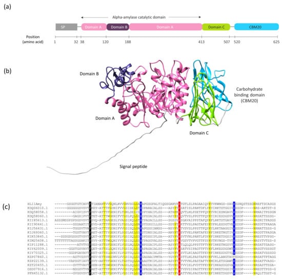 Domain organization and overall structure of HL11Amy. (a) Schematic representation of domain organization in HL11Amy. (b) The predicted three-dimensional structure of HL11Amy from R. terrae HL11. (c) Sequence alignment of CBM20 in HL11Amy and α-amylases in GH13_32. The 11 conserved amino acid residues in CBM20 based on [29,30] are highlighted. Two tryptophans of binding site 1 and one tryptophan of binding site 2 are highlighted in blue and red, respectively. The remaining eight residues are highlighted in yellow. The additional well-conserved phenylalanine in CBM20 is in black. The list of proteins is given in Table S2.