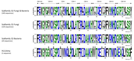 Sequence logos of eight conserved sequence regions (CSRs) found in HL11Amy and α-amylases from studied GH13_32 subfamily. The catalytic triad including aspartic acid in CSR-II, glutamic acid in CSR-III and aspartic acid in CSR-IV are indicated by asterisks. The unique amino acid residues only found in HL11Amy are indicated by black circles.
